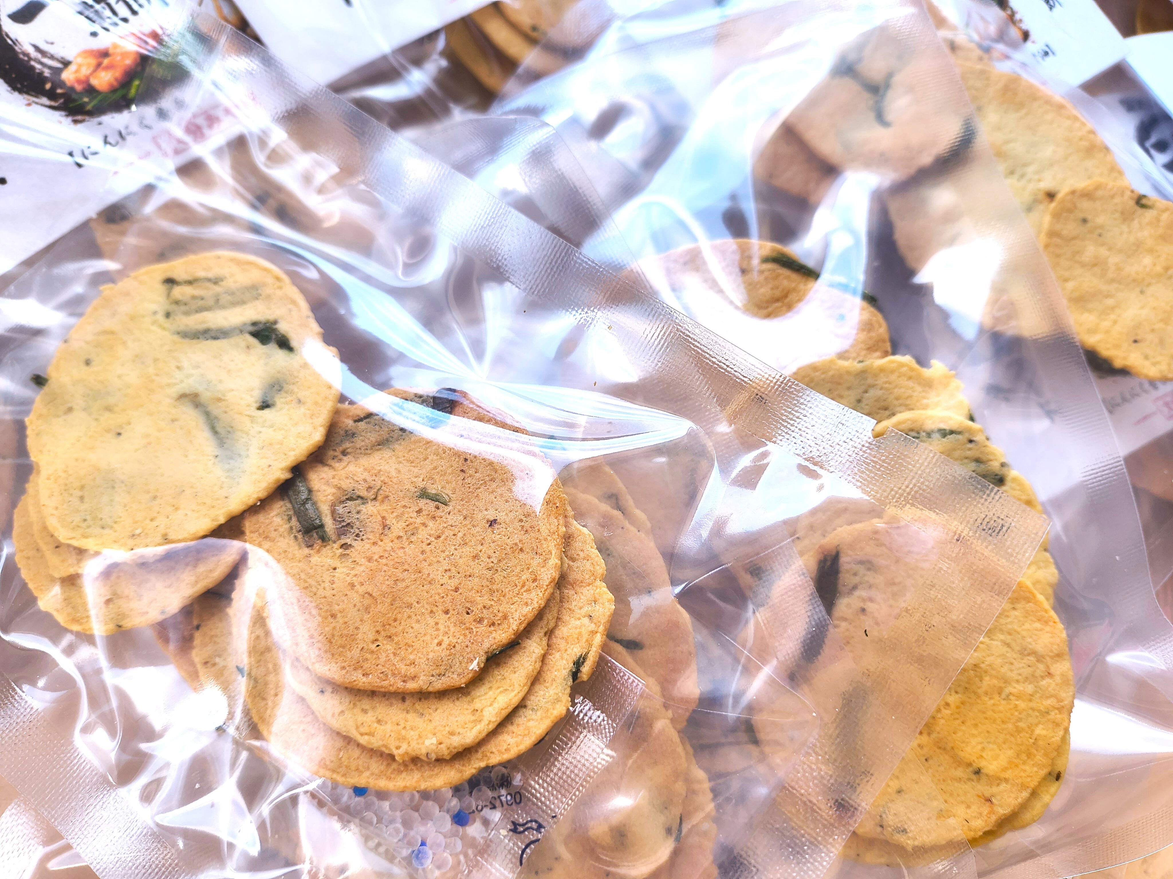 ニラの爽やかな香りと、甘めの醤油とにんにくの味が効いたサクサクとした食感のせんべいです。