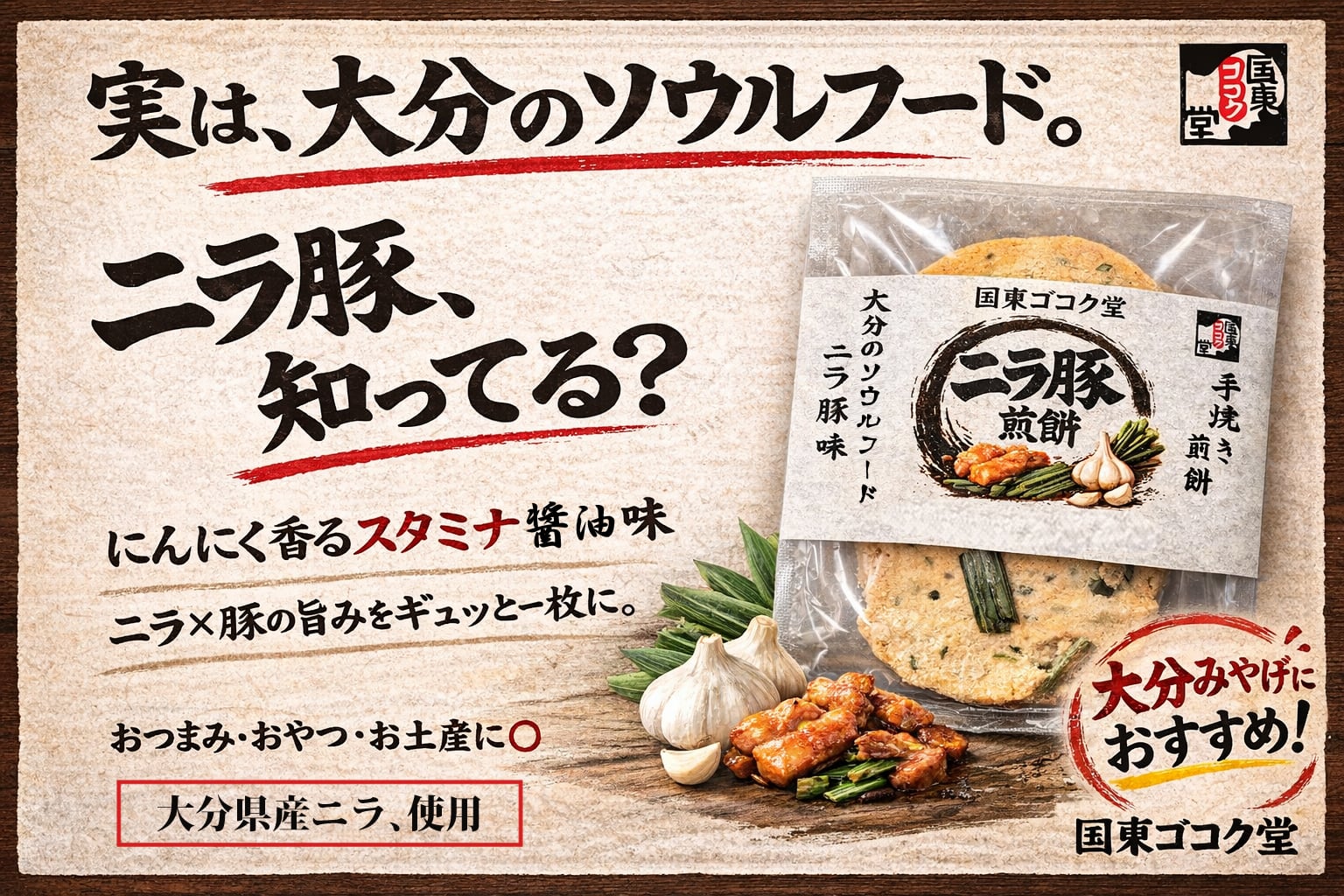 大分の隠れたソウルフード「ニラ豚」を煎餅にしました。